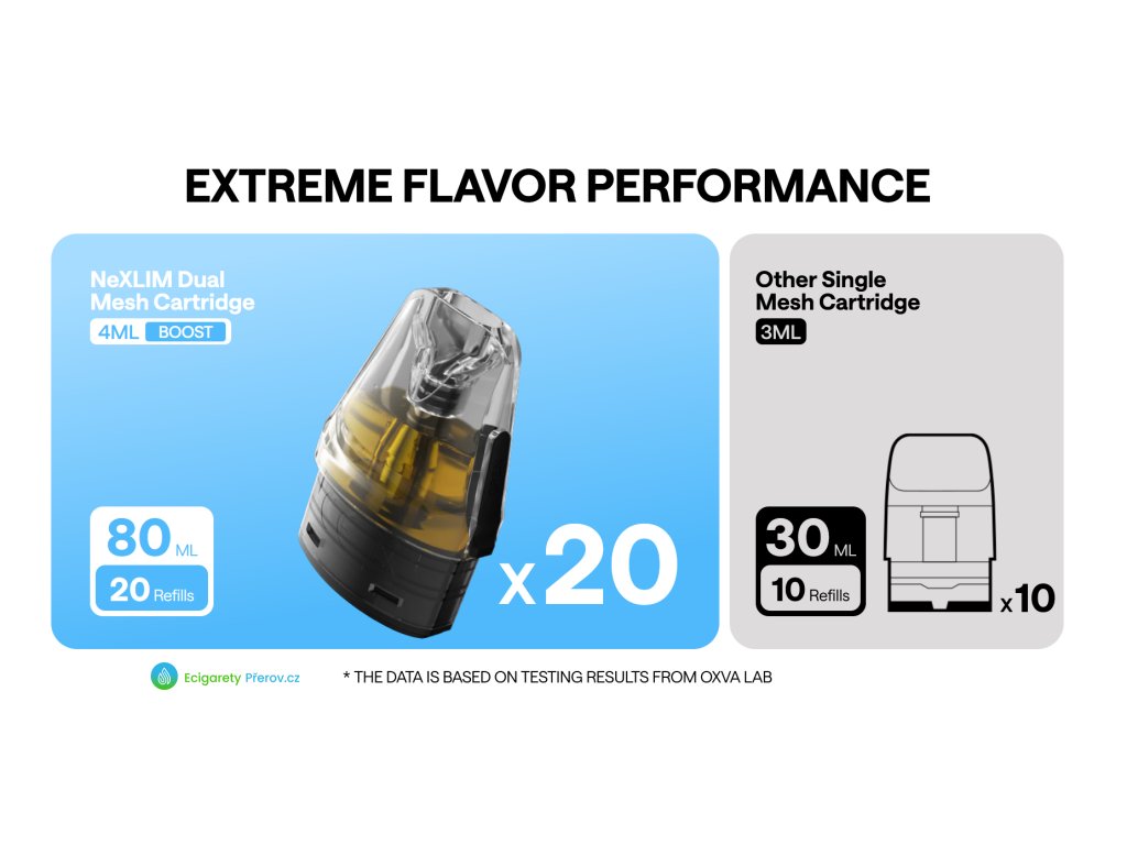 OXVA NeXLiM GO představuje moderní POD systém s důrazem na výkon, výdrž a chuť. Díky technologii Dual Mesh poskytuje až o 200 % lepší chuť a životnost ve srovnání s běžnými cartridgemi. Výkonná baterie 1800mAh zajišťuje až 10 dní provozu v ECO režimu, s rychlým 5V/2A USB-C nabíjením. Přepínání mezi režimy BOOST a ECO přináší 6 různých vaping zážitků (0.6Ω / 0.8Ω / 1.2Ω), pro styl MTL i RDL. Zařízení je kompatibilní se všemi NeXLiM cartridgemi i žhavicími hlavami a podporuje jak klasický nikotin, tak i nikotinové soli.