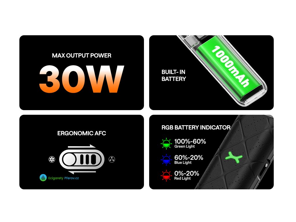 Ke svému chodu je zařízení osazeno kvalitním čipem, poskytujícím maximální výkon až 30W, standardní ochranné prvky, rychlé nabíjení zabudované 1000mAh baterie prostřednictvím portu USB-C v podstavě. Poskytne vám tak dlouhou dobu i pro celodenní vapování a v případě potřeby rychlé nabití již za 30 minut.