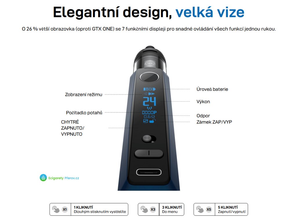 Praktický a stylový mód s tankem, který ocení zejména příznivci MTL a RDL vapování? Máme pro Vás Vaporesso GTX One Pro. Těšit se můžete na elegantní a kompaktní tělo s ergonomickými křivkami, jenž perfektně padne do ruky a je dostupné v provedení z luxusní umělé kůže nebo silikonového materiálu s příjemně sametovou povrchovou úpravou. Díky minimalistickému designu a kompaktním rozměrům je ideální pro každodenní použití i pohodlné přenášení.