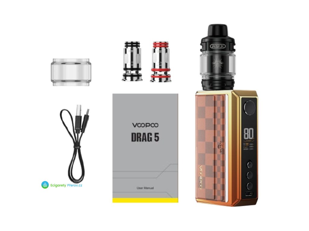 VooPoo Drag 5 je již pátou generací nesmírně populárního box modu Drag. Pátá generace přináší nejnovější inovace ve vapingu, luxusní designové zpracování a strhující výstupní výkon s maximální hodnotou 177W. V kompletním setu potom obsahuje také upgradovaný clearomizér UFORCE-X Tank s podporou platformy PnP-X, obrovským objemem, inovativním horním plněním a horním systémem airflow. Vylepšené pokročilé technologie modu a vylepšený design celého zařízení pozvednou zážitek z vapování do nových výšin a připraví vám neopakovatelný požitek při každodenním používání.