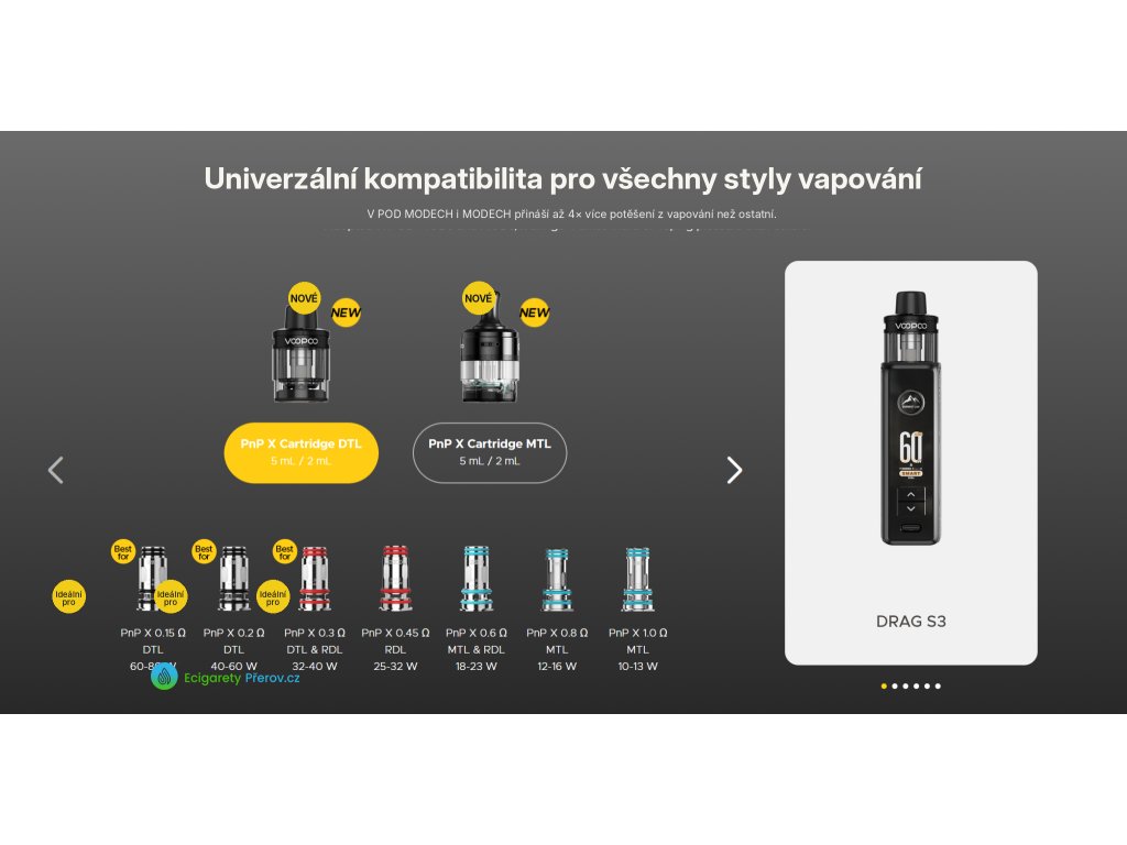 Elektronická cigareta VOOPOO DRAG S3 nabízí výjimečnou variabilitu potahového stylu – plně vyhovuje příznivci utaženého MTL vapování, ale bez problémů zvládne také volnější RDL nebo přímé DL potahy. Klíčovou roli hraje chytrý Smart režim, který automaticky detekuje odpor nainstalované žhavící hlavy a nastaví optimální výkon bez nutnosti ručního zadávání hodnot. Přehledný 0,96palcový TFT displej zobrazuje všechny důležité provozní údaje a díky volbě z několika grafických motivů si každý uživatel přizpůsobí vzhled rozhraní podle svých preferencí. Součástí balení je PnP X MTL cartridge s objemem 2 ml vyrobená z nerezové oceli a PCTG, doplněná o magnetický kontakt pro rychlou a spolehlivou výměnu. V sadě jsou rovněž dvě mesh žhavící hlavy PnP X – odporová varianta 0,6 Ω (doporučený výkon 18–23 W) pro volnější MTL a RDL styl a varianta 0,8 Ω (doporučený výkon 12–16 W) pro klasické pusa-plíce vapování. Plnění cartridge probíhá pohodlně přes spodní silikonovou krytku a nastavitelný přívod vzduchu umožňuje precizní ladění volnosti potahu. Volitelný 510 náustek pak rozšiřuje kompatibilitu a personalizační možnosti celého systému.
