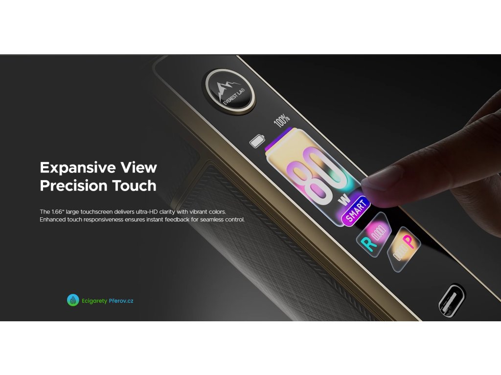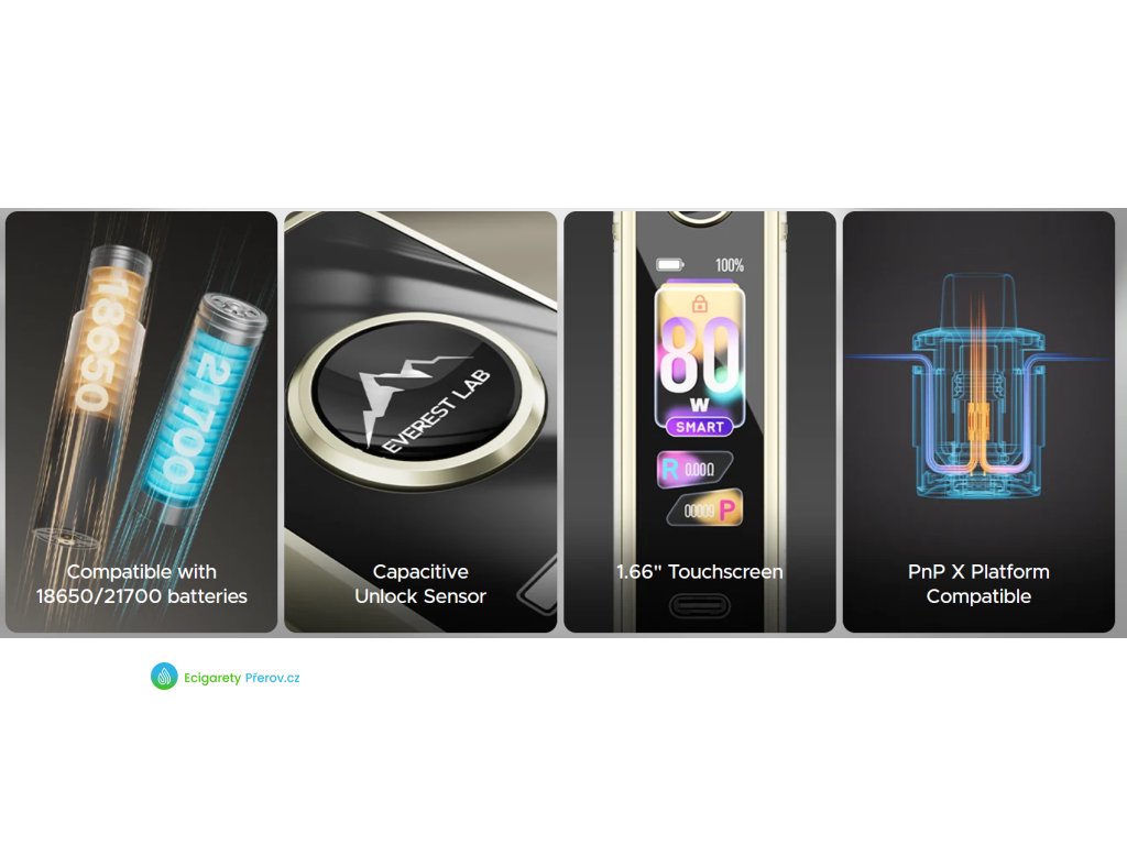 Mohutný výkon 80 W a slot pro externí baterii: mód je poháněn jednou externí baterií typu 18650 nebo 21700 (není součástí balení). Použití silnější baterie 21700 zajišťuje delší výdrž při vapování s vysokým výkonem (až 80 W).