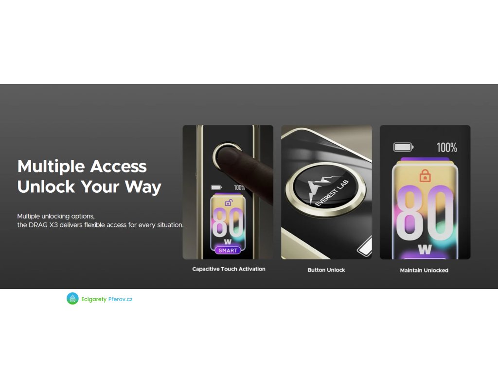 Drag X3 disponuje výkonem až 80 W a hned třemi výstupními režimy: RBA, ECO a Smart. Režim RBA slouží k manuálnímu nastavení výkonu. Eco zajišťuje prodloužení výdrže baterie tím, že nastavuje méně agresivní křivku žhavení. Smart zase nabízí pohodlí, jelikož výkon nastaví automaticky dle zvolené žhavící hlavy. Samozřejmostí jsou bezpečnostní ochrany proti dlouhému žhavení, zkratu, přehřátí, a přepětí, přebití a podbití baterie.
