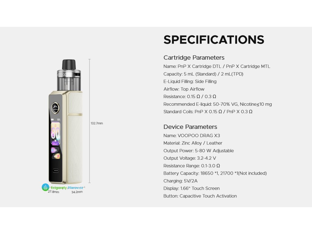 VooPoo Drag X3 s PnP X tankem je nejnovější verzí velmi populárního, všestranného POD kitu nejen pro pokročilé uživatele. Nabízí skvělou platformu pro vaping všech typů potahů. Nabízí výkon až 80 W, slot pro jednu 18650 nebo 21700 baterii, 1,66" dotykový displej a podporu žhavících hlav PnP-X, díky kterým je možné zařízení nakoncipovat na veškeré typy potahů. S DTL cartridgí má zařízení objem 5 ml (dokoupitelná MTL cartridge disponuje stejným objemem).